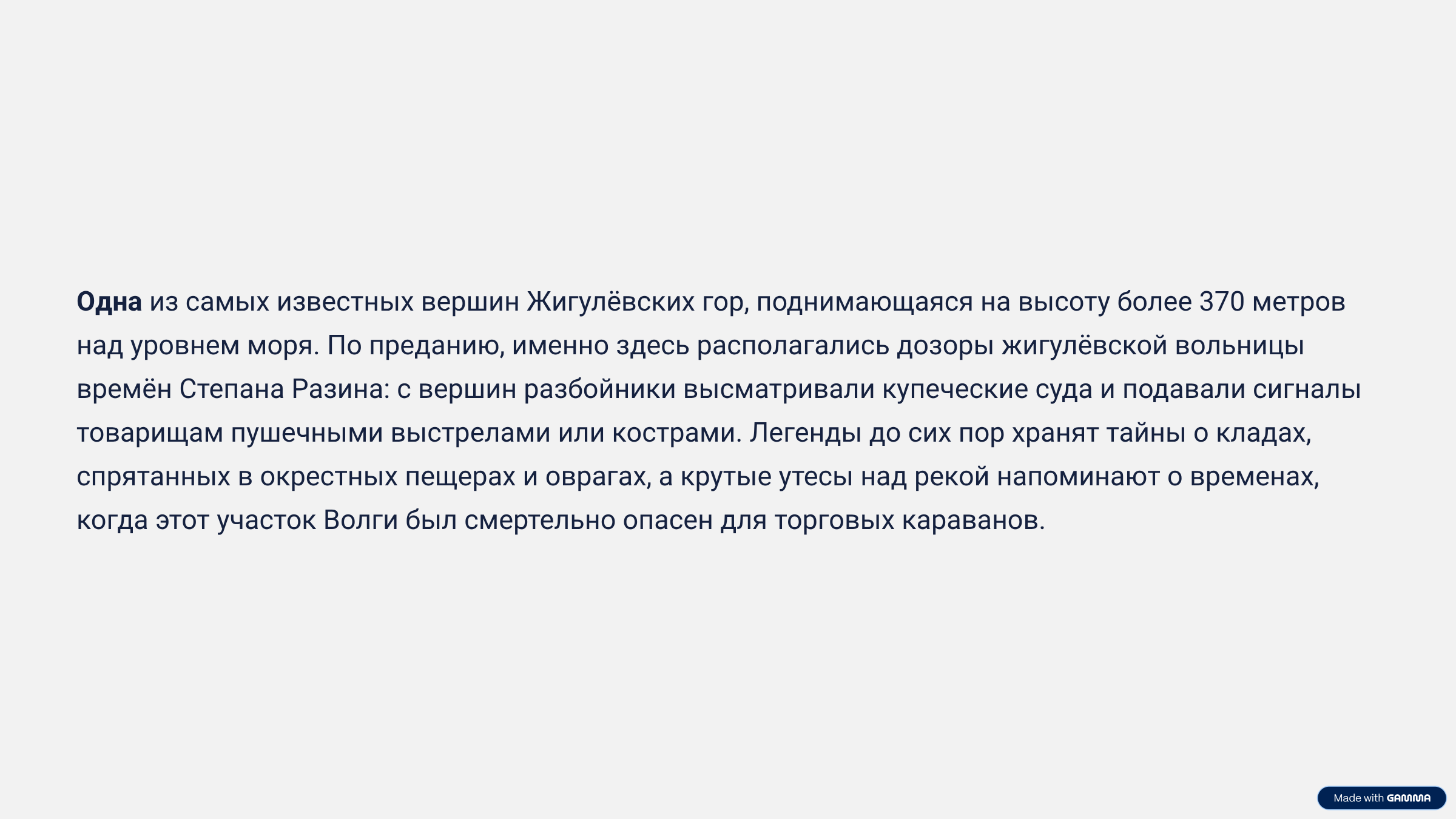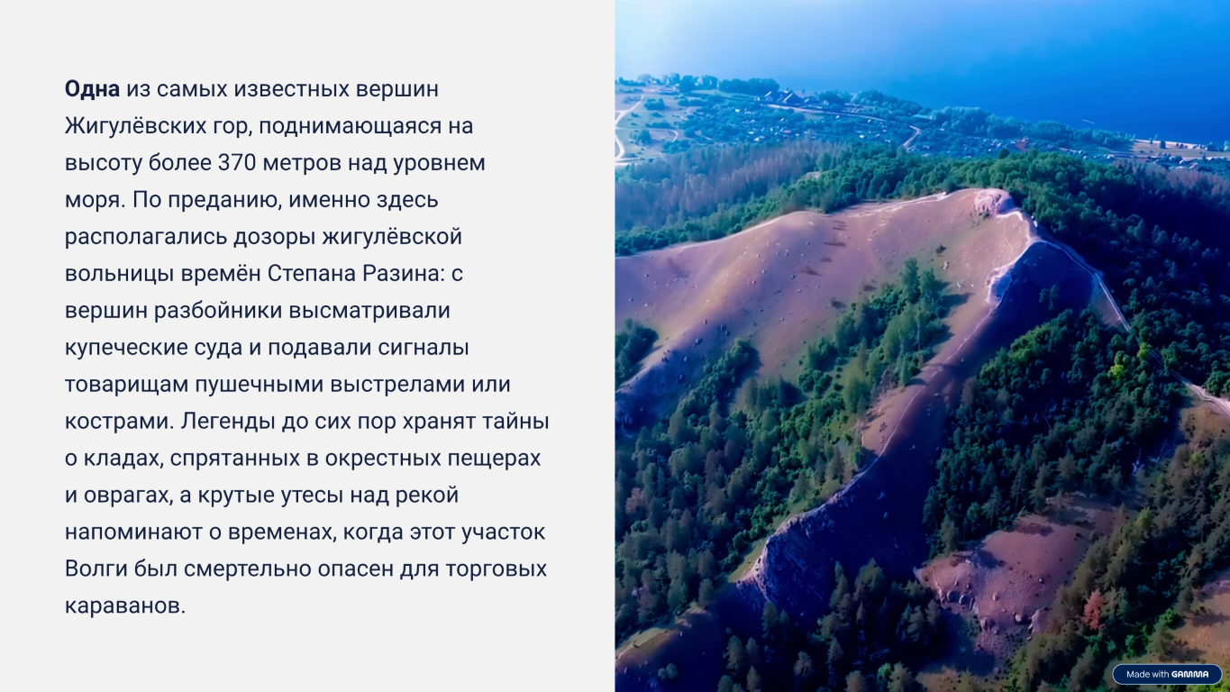 Одна из самых известных вершин Жигулёвских гор, поднимающаяся на высоту более 370 метров над уровнем моря. По преданию, именно здесь располагались дозоры жигулёвской вольницы времён Степана Разина: с вершин разбойники высматривали купеческие суда и подавали сигналы товарищам пушечными выстрелами или кострами. Легенды до сих пор хранят тайны о кладах, спрятанных в окрестных пещерах и оврагах, а крутые утесы над рекой напоминают о временах, когда этот участок Волги был смертельно опасен для торговых караванов.
